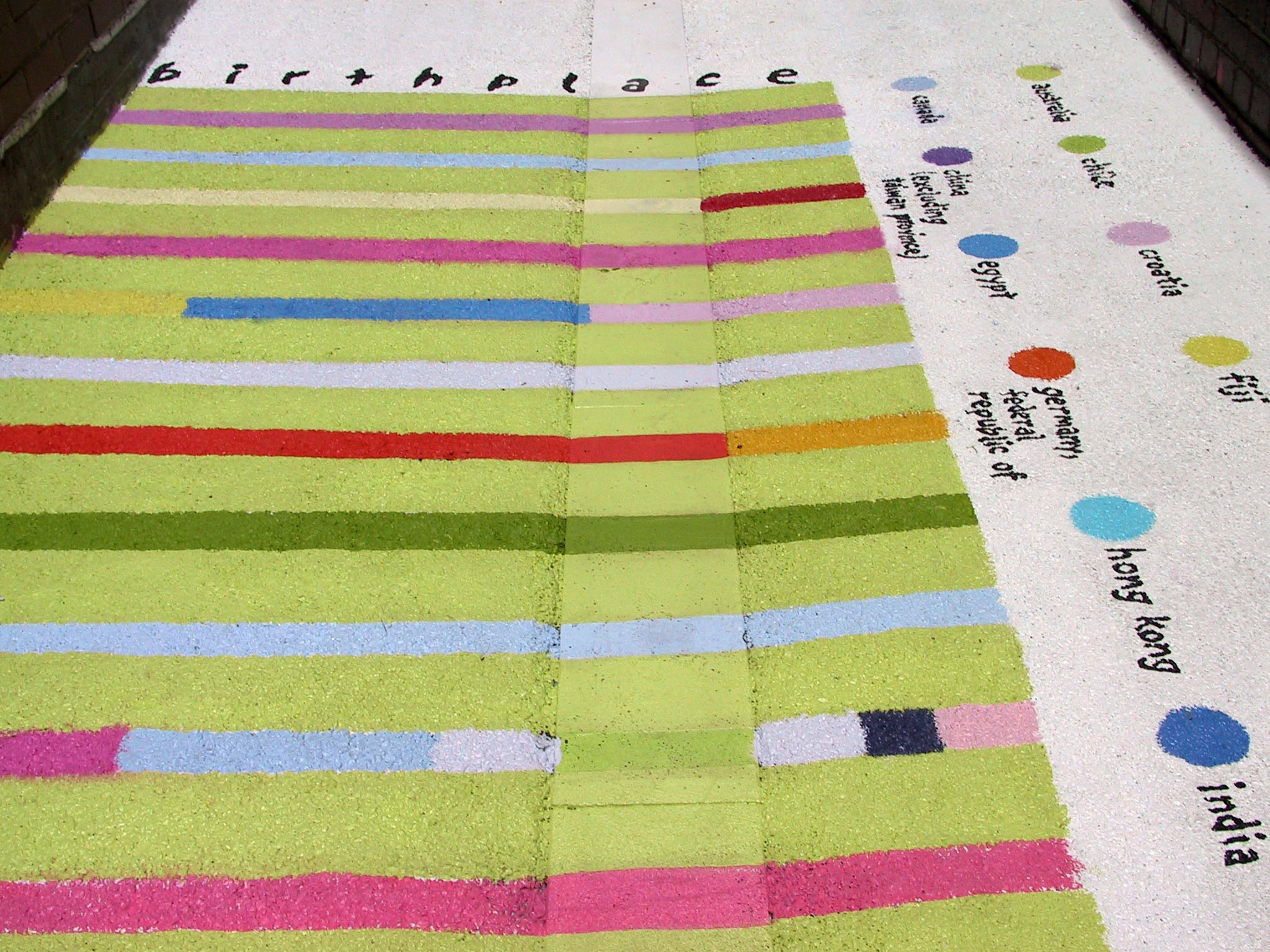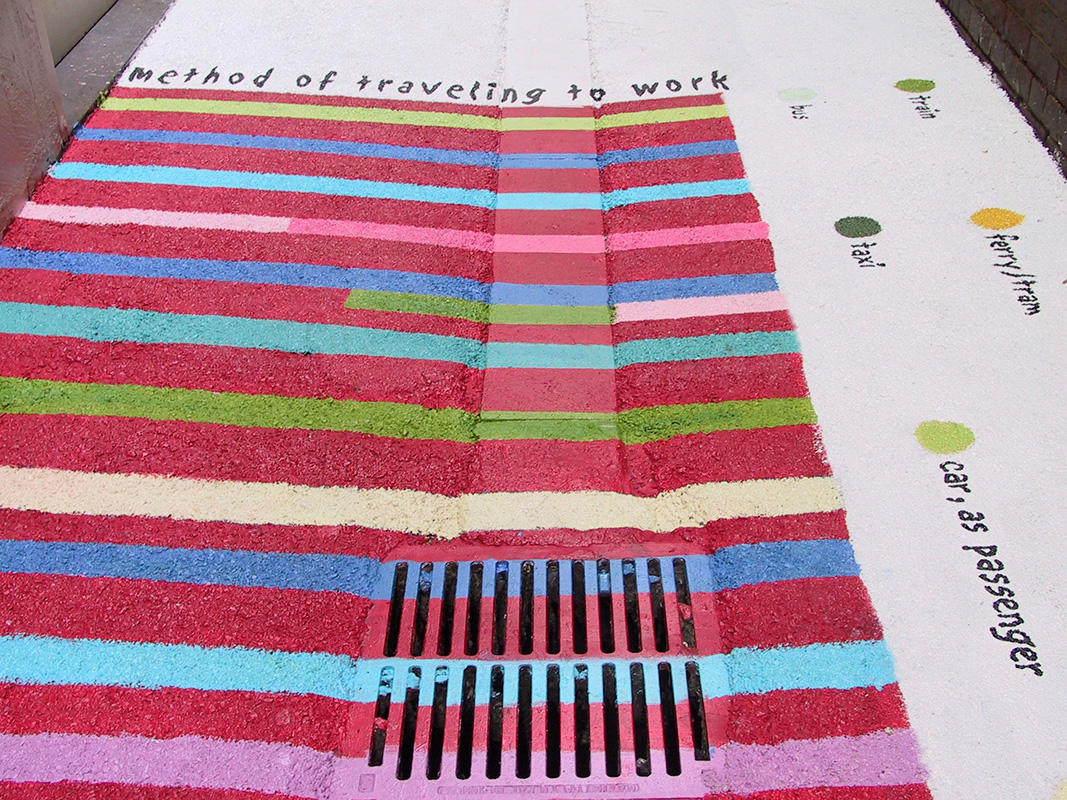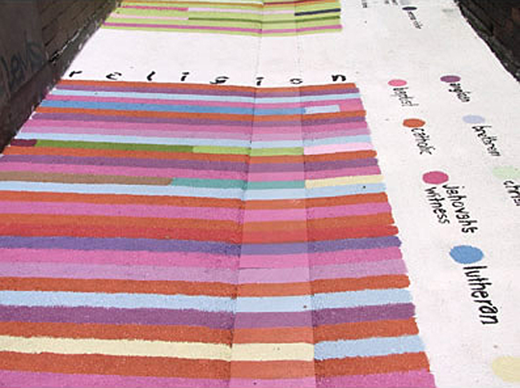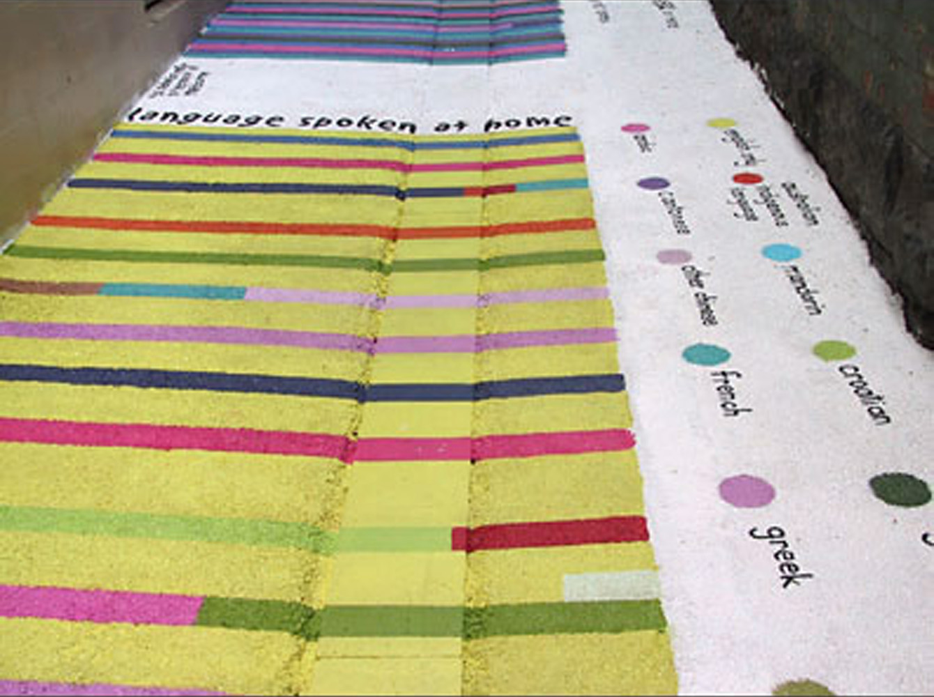 Eight abstracted graphs based on demographics about the people of Melbourne were painted directly onto the laneway’s asphalt surface. The bright colours enlivened the alley and enticed Melbournians to find themselves in each of the charts as they walked along.