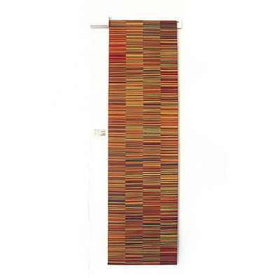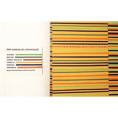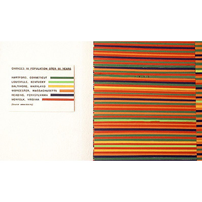 Inspired by the use of statistics as a vehicle for information the three drawings in A rounding of facts scroll slowly and regularly downward. Each scroll is based on a set of data. The data was firstly broken into four categories, which form the long vertical bars of the drawing, and six colours were used to represent the six common elements across the four bars.