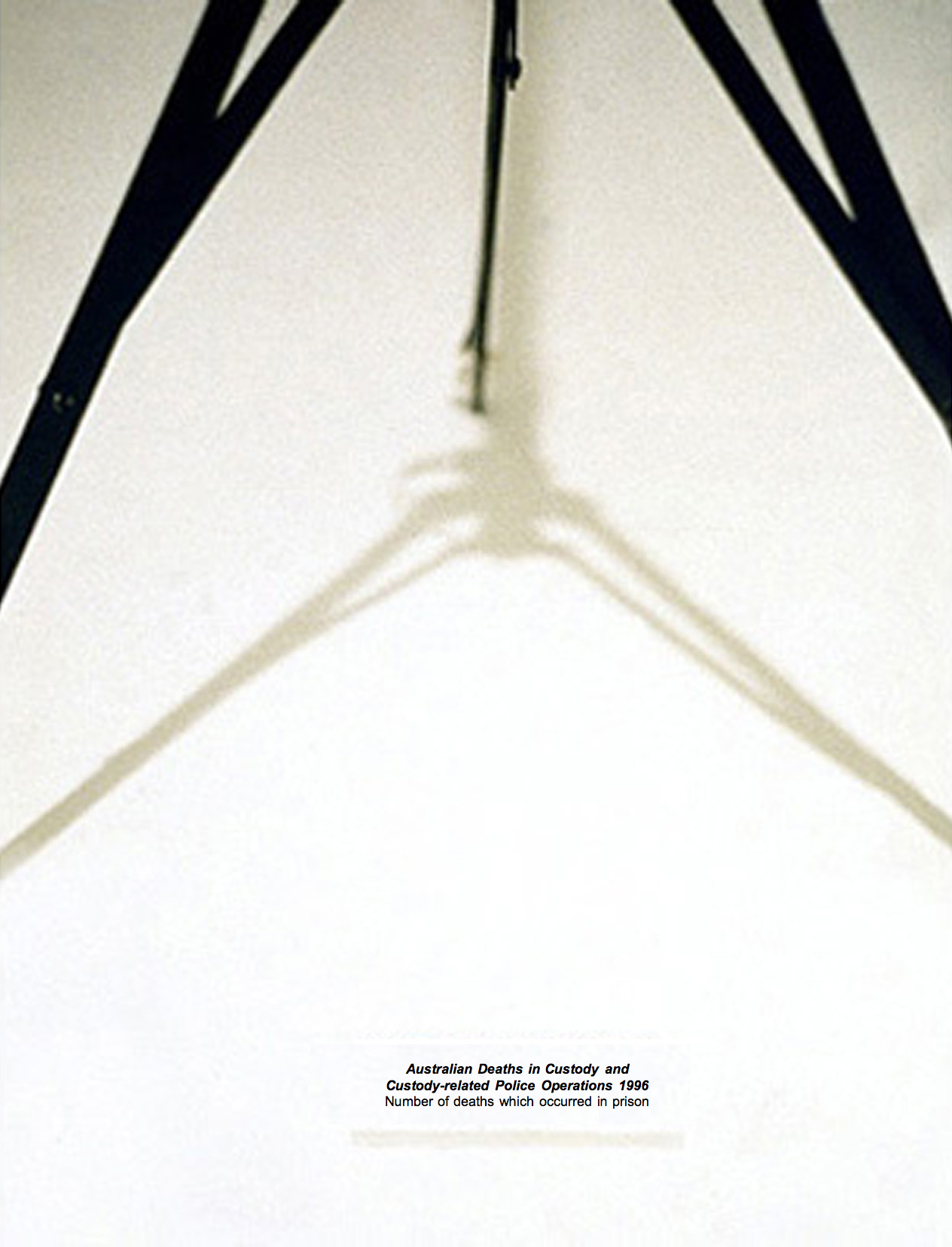 Another rounding of facts focused on the results of the Australian Bureau of Statistics 1996 research into Deaths in Custody and Custody Related Events. Digital metronomes atop seven-foot tall stands beeped out the statistical findings of six of the areas researched. Each viewer was asked to enter the installation room alone and to follow a specific path. The arhythmic pattern of sound called to mind mourning bells or cries of lamentation.