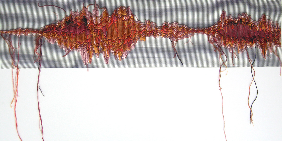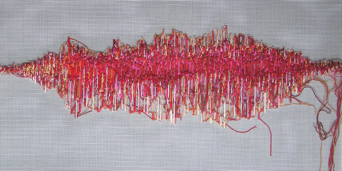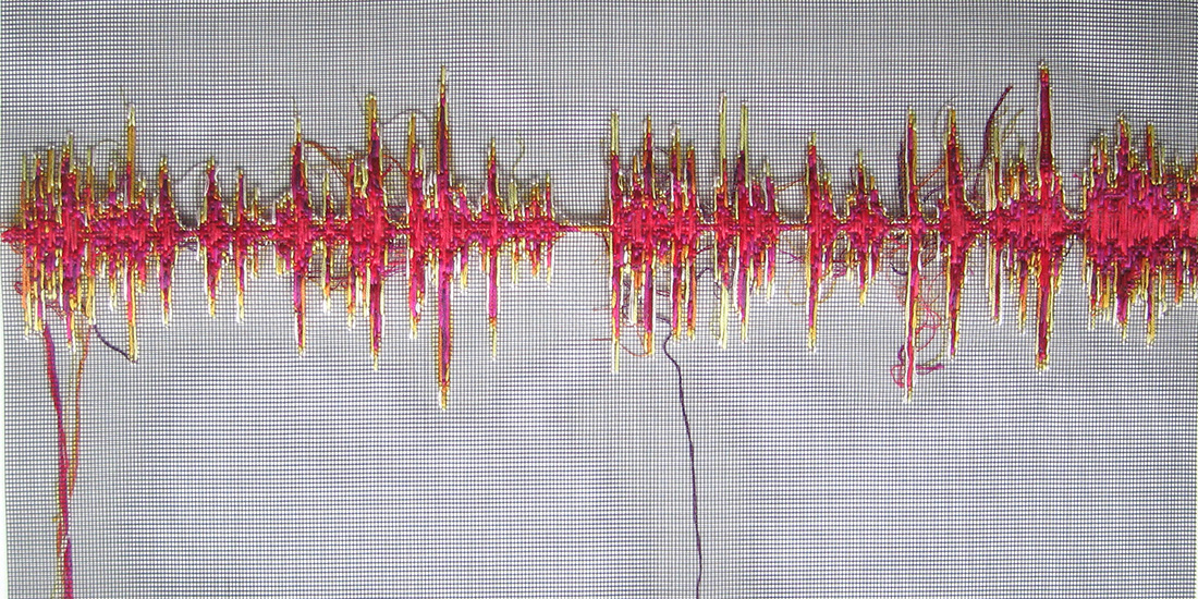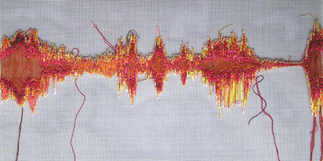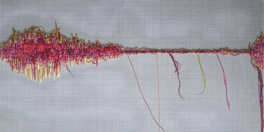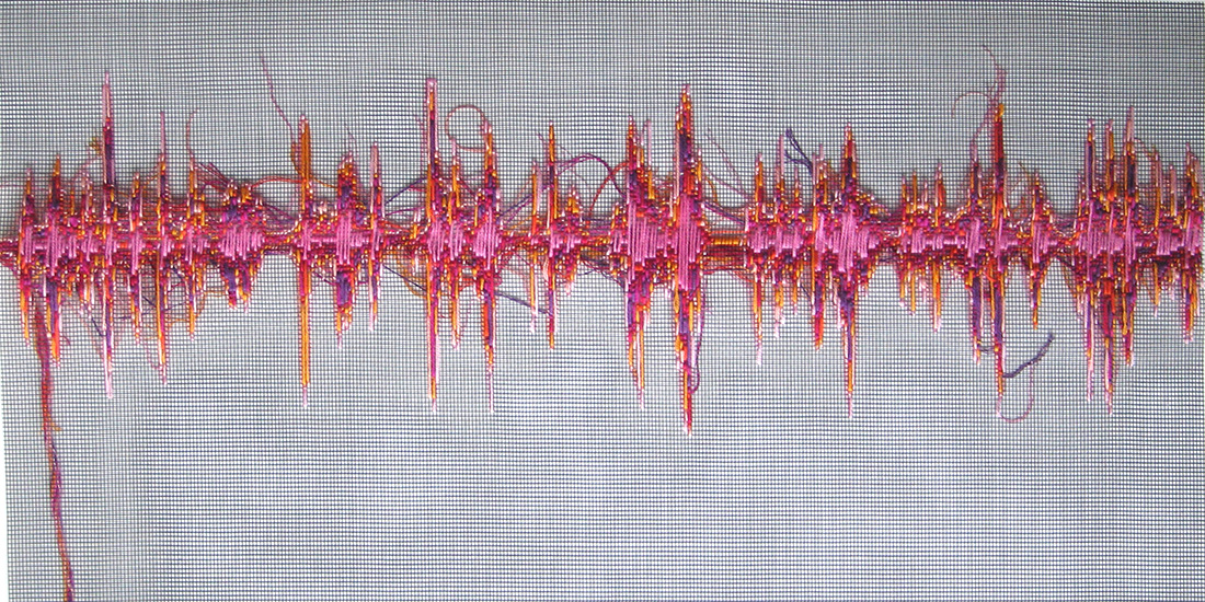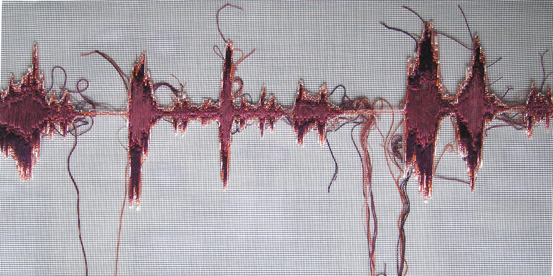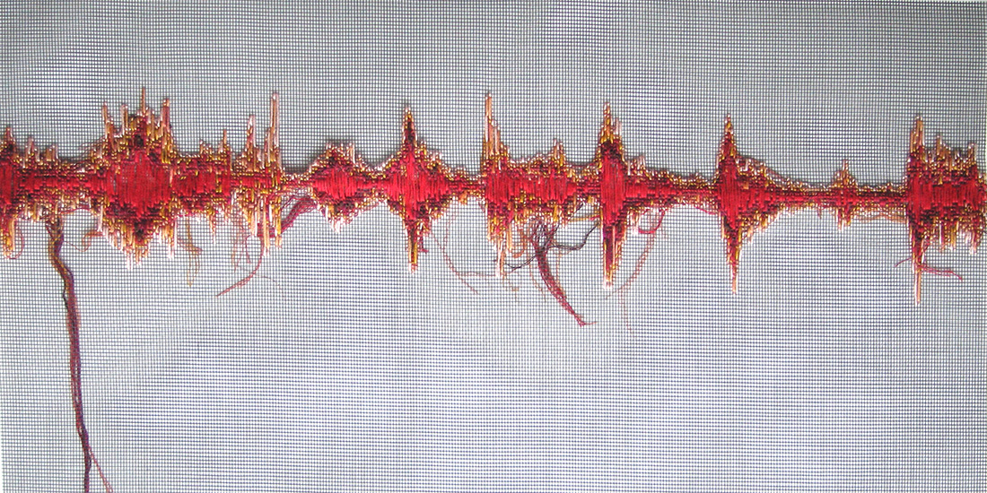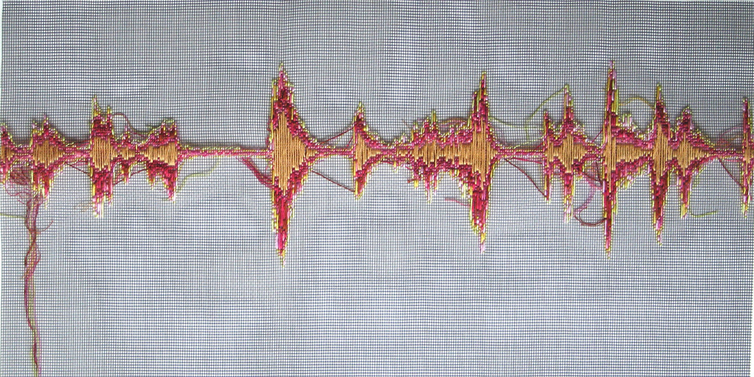 Into this trickery I’ve stitched fragments of soundwaves. Each fragment is taken from an anti-war speech given at a rally in Adelaide in September last year and the text of each fragment is noted in the title of the piece. The title of every piece also notes that each fragment has been accredited to a different, hypothetical anti-war speech from throughout history – the speaker, the war, and the place, date and time of the speech are all noted.
