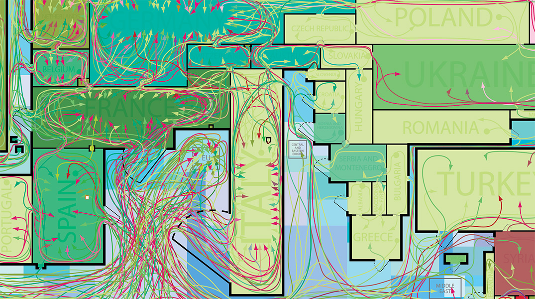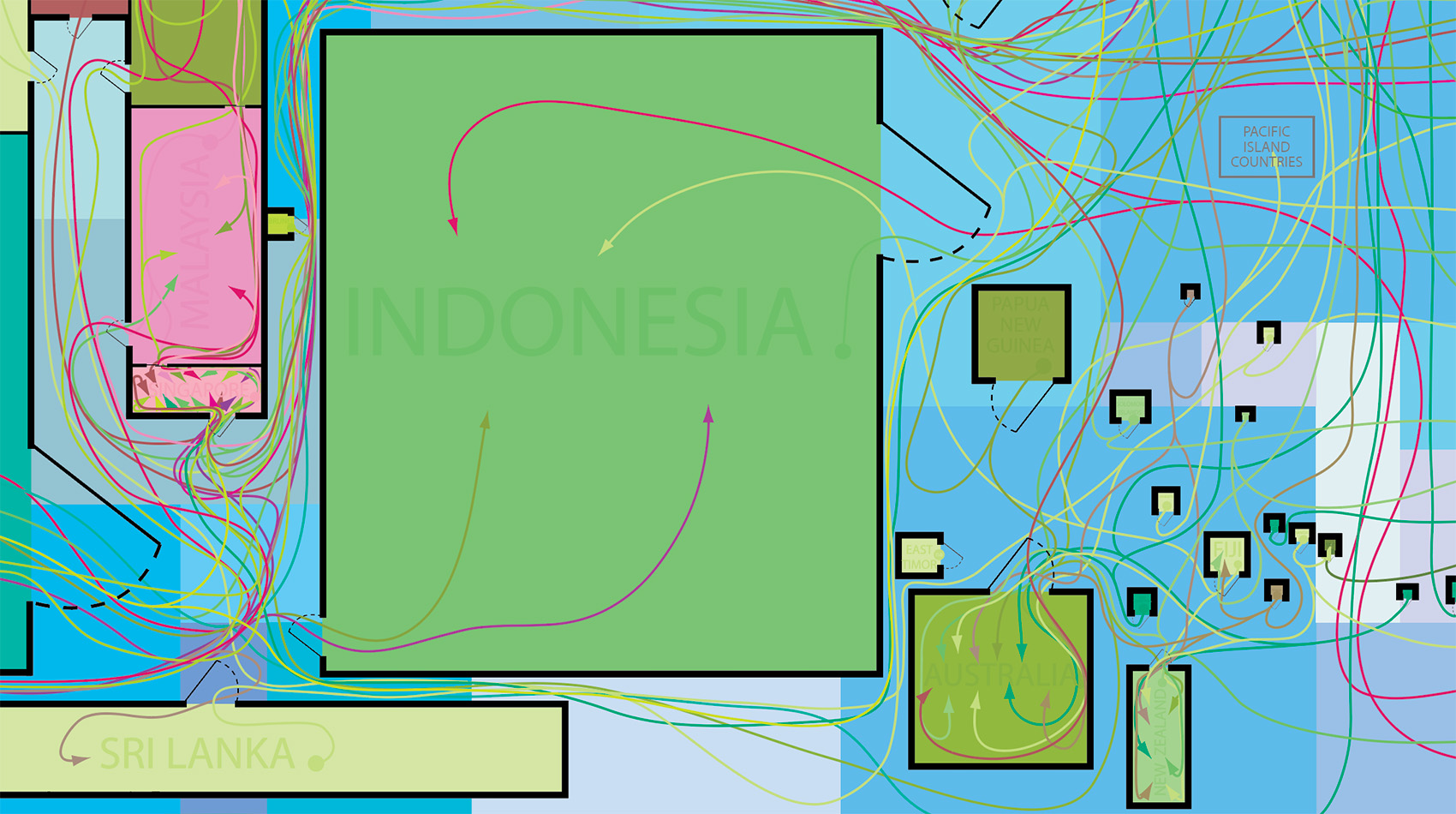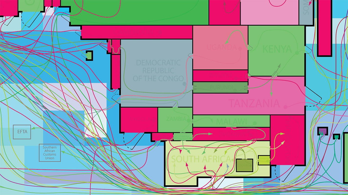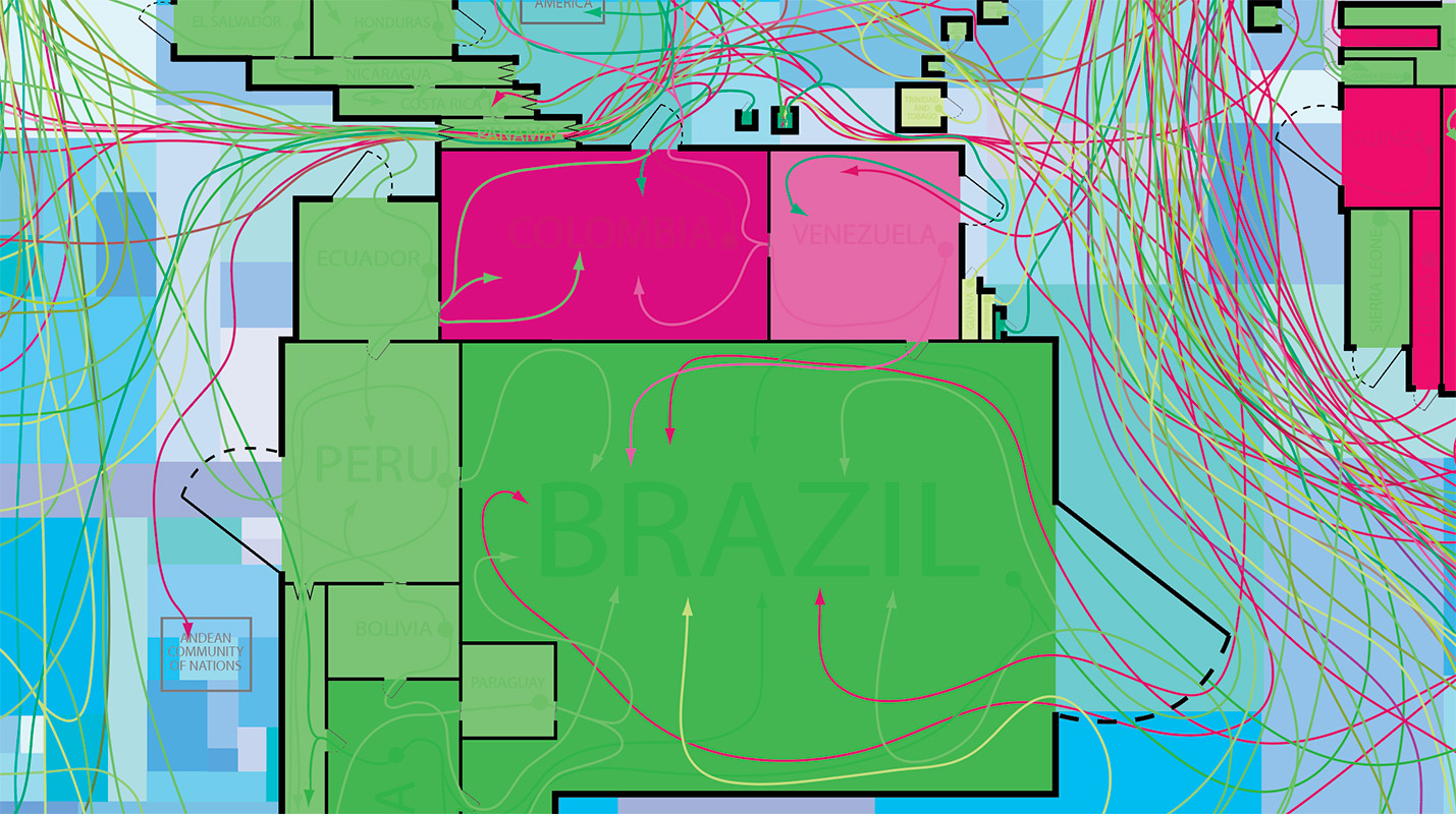 Export Distribution is a map of the world highlighting major export trade partners between countries. Countries are sized in proportion to their population and their colours reflect their ruling regimes. Arrows indicating the major export trade partners move between the countries. The information required to create this piece was sourced from the CIA’s World Factbook.