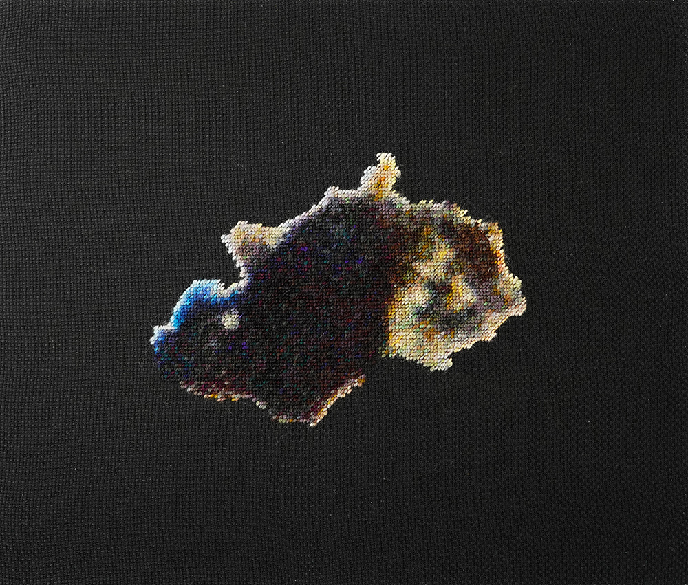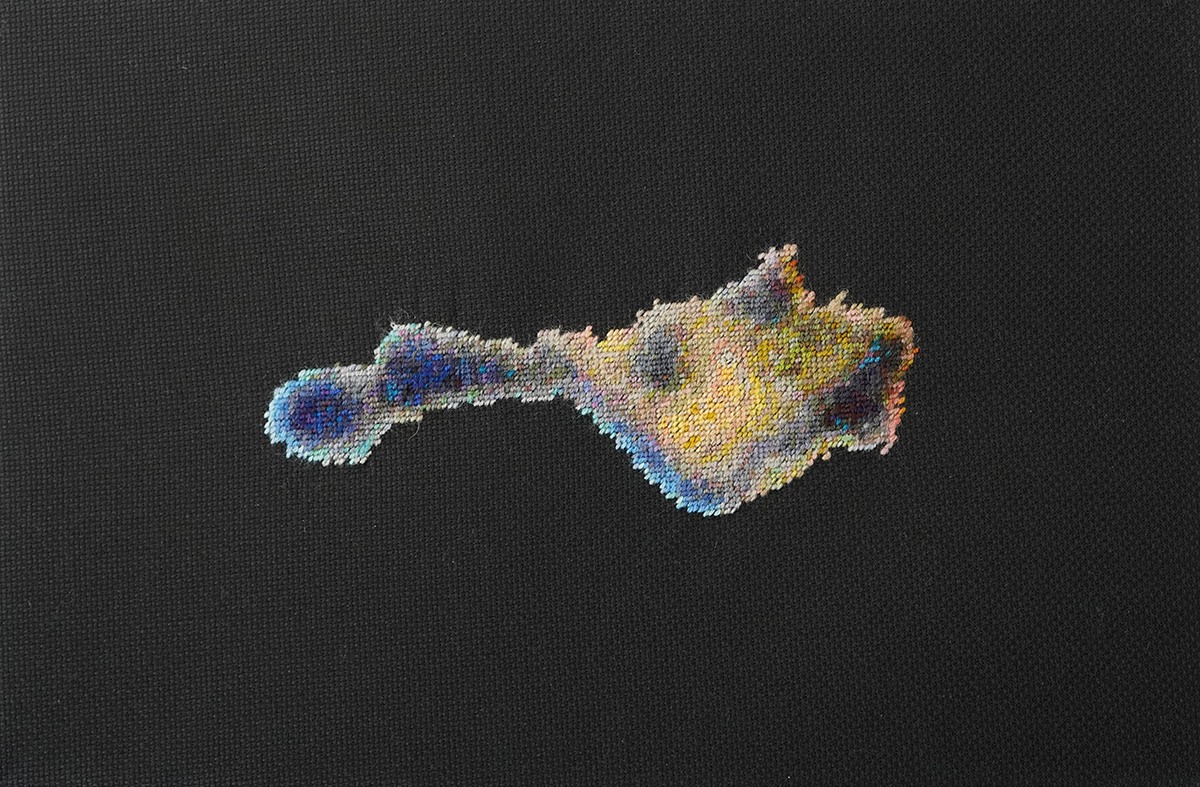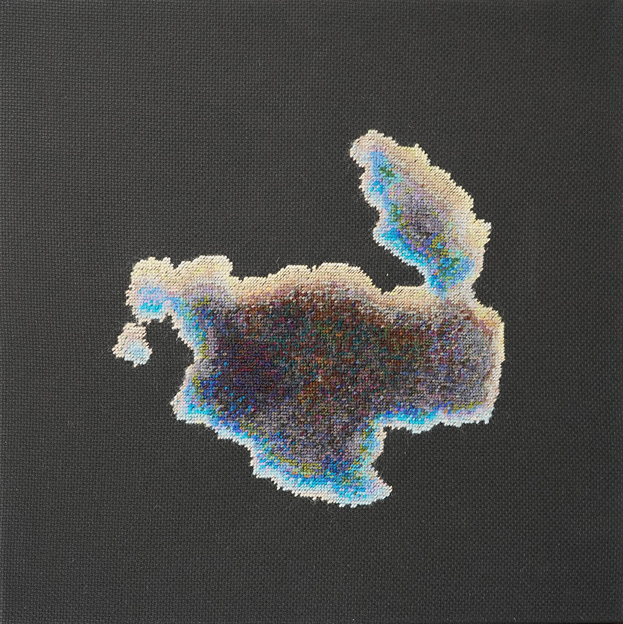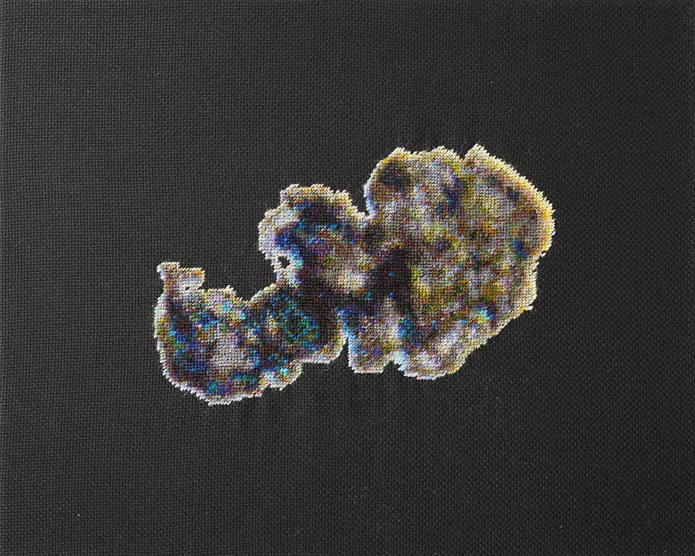 These needlepoints get their imagery from magnified sediments that remained on the soles of my feet after a swim the Birrarung, a local river. They consider the agency of the sediment and the way place and history can stick to us.