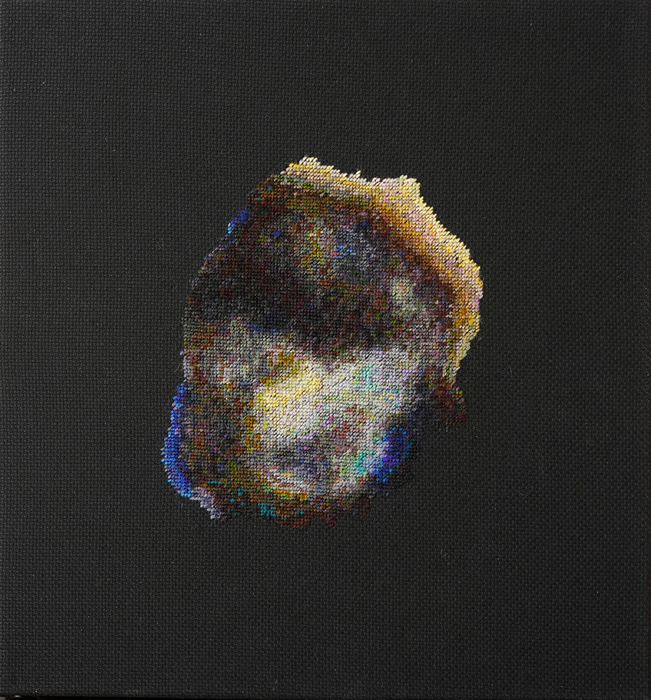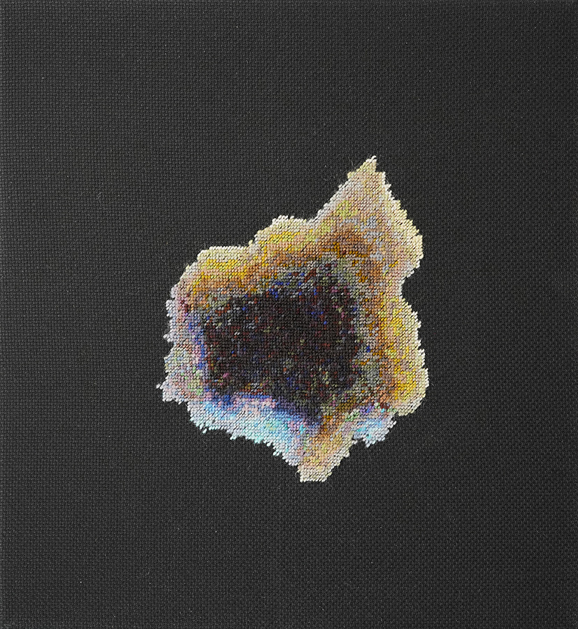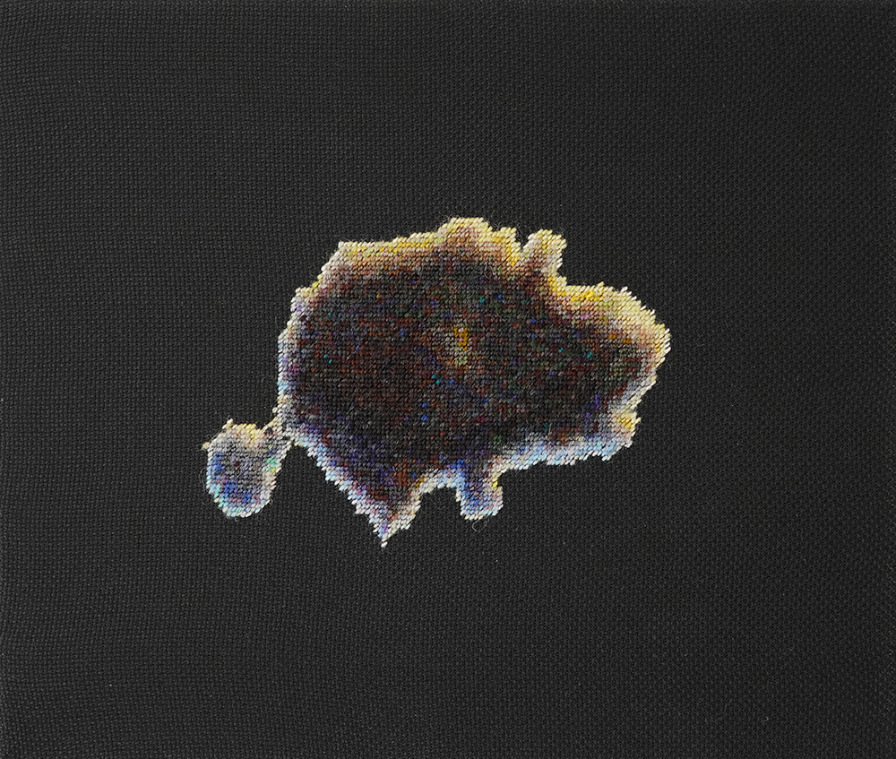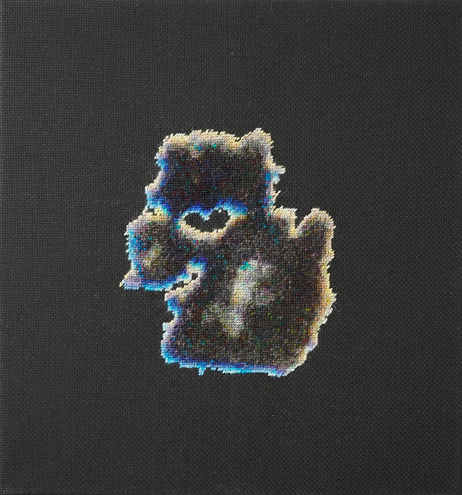 These needlepoints get their imagery from magnified sediments that remained on the soles of my feet after a swim the Birrarung, a local river. They consider the agency of the sediment and the way place and history can stick to us.