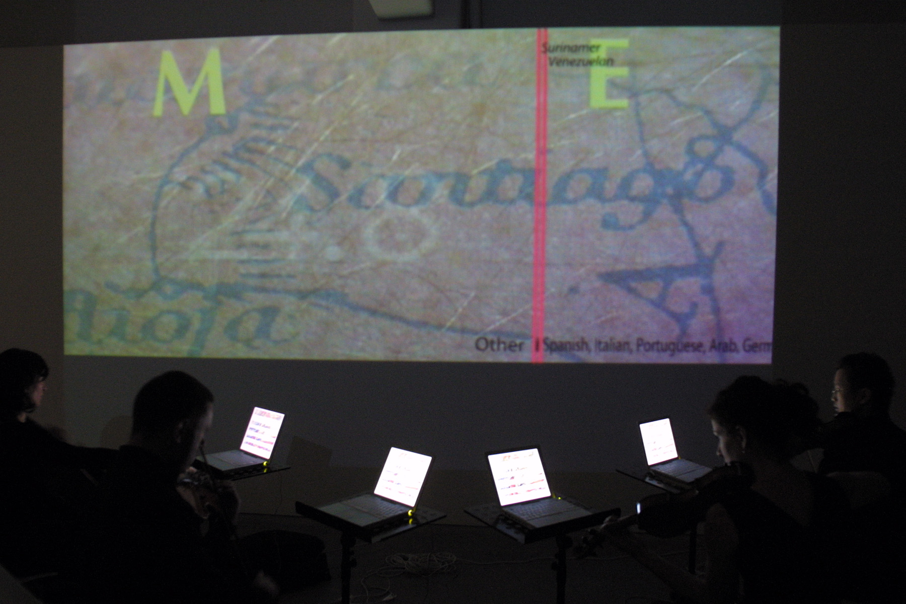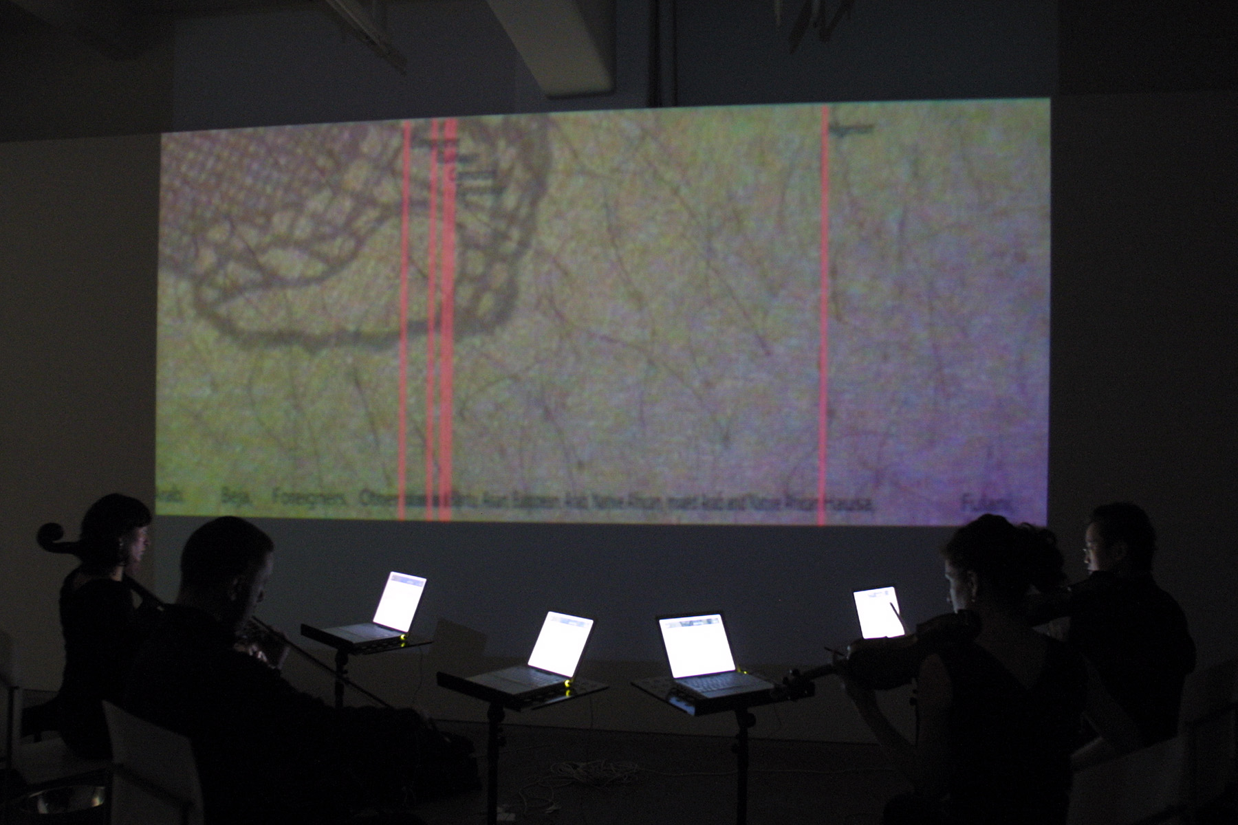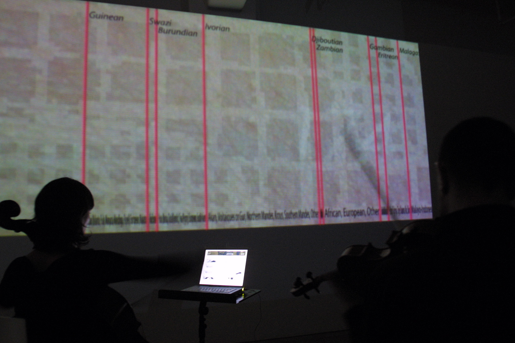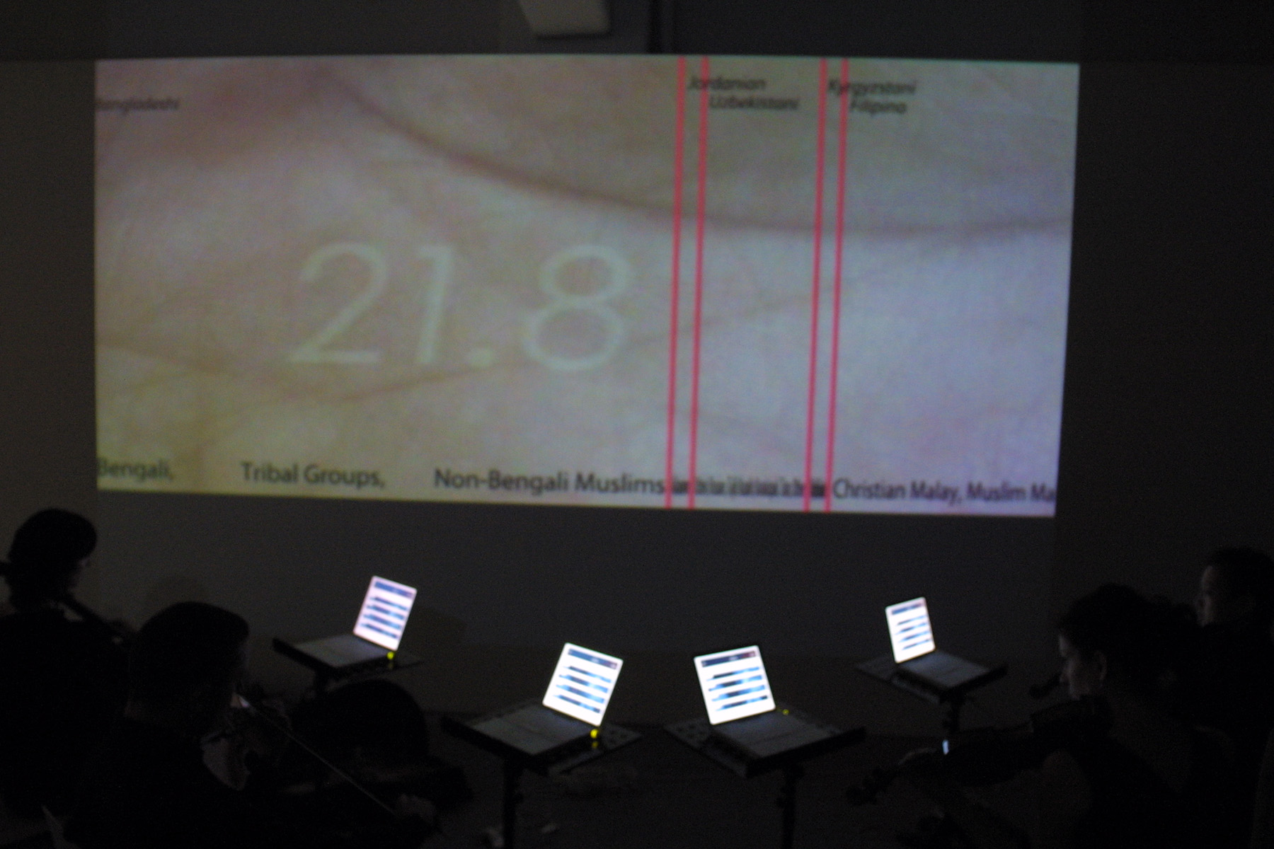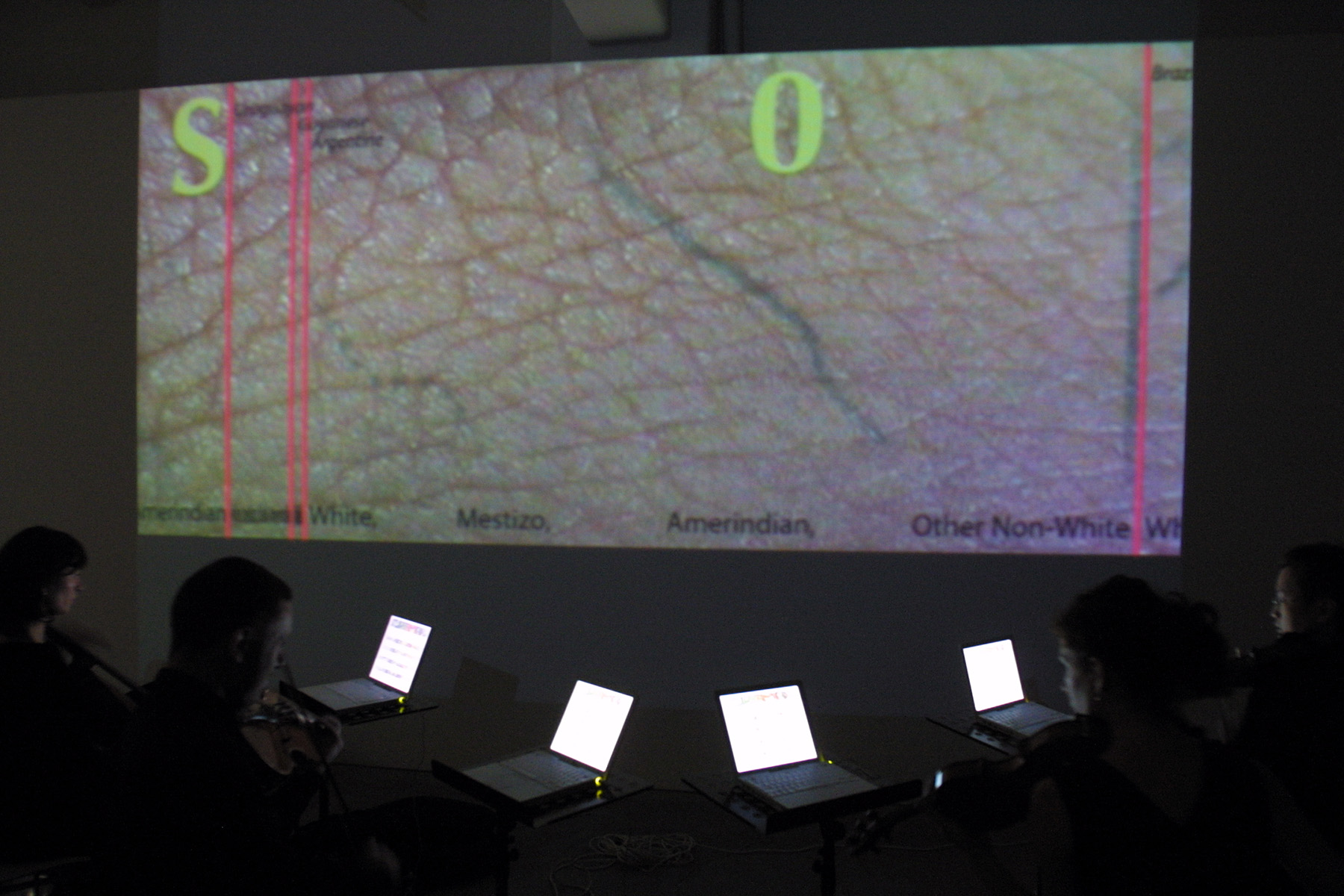 Drawing from the relentless lists of ethnicities, populations and life expectancies recorded in the CIA Factbook, Bufardeci and Young compose a series of panoramic micro-landscapes of skin employing digital and acoustic instruments. Skin Quartet was presented as a part of the Melbourne International Arts Festival, October 2003.