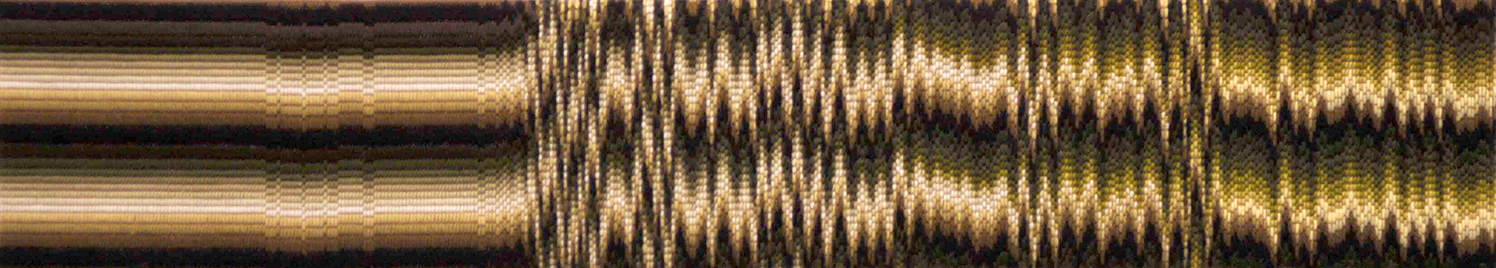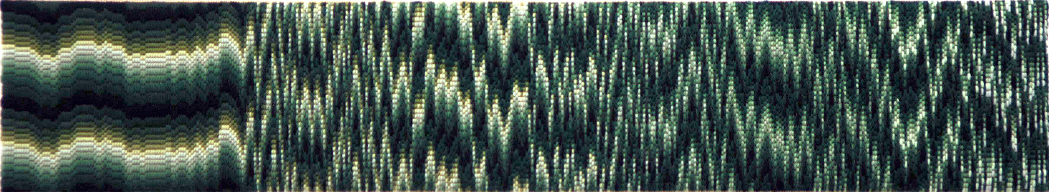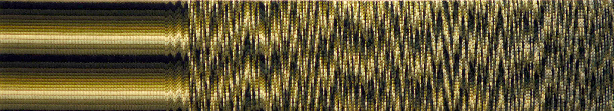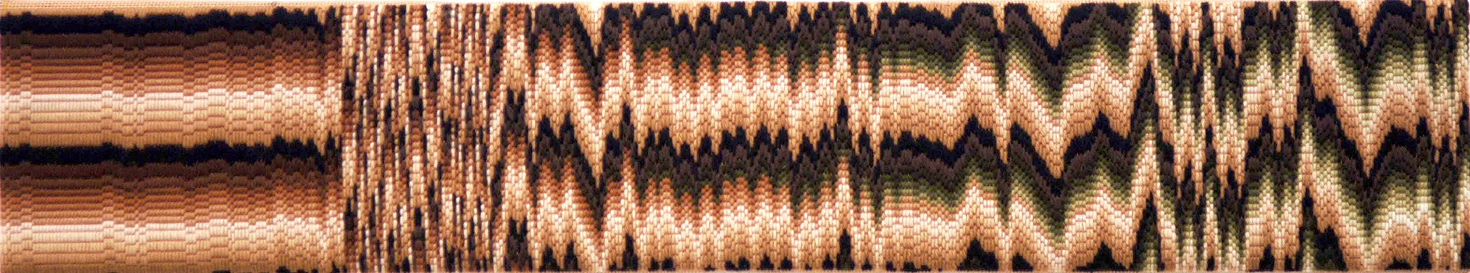 Starter Pistols is an exhibition of six bargello needleworks. The design of each needlework illustrates soundwaves associated with various anti-personnel weapons. Each soundwave is a mere one one-hundredth of a second in length and captures the split-second a weapon is discharged. One of the designs is based on the sound of the Browning 1910 handgun used by Gavrilo Princip to assassinate the Archduke Franz Ferdinand of Austria in Sarajevo in 1914.