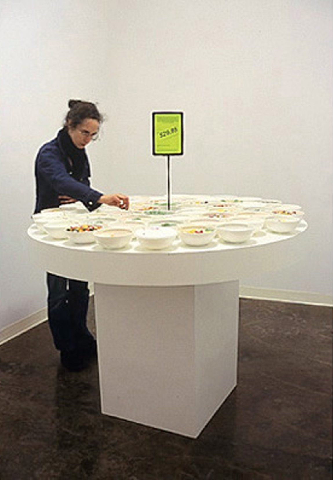 table, bowls, lollies and text, 110cm x 140cm x 140cm