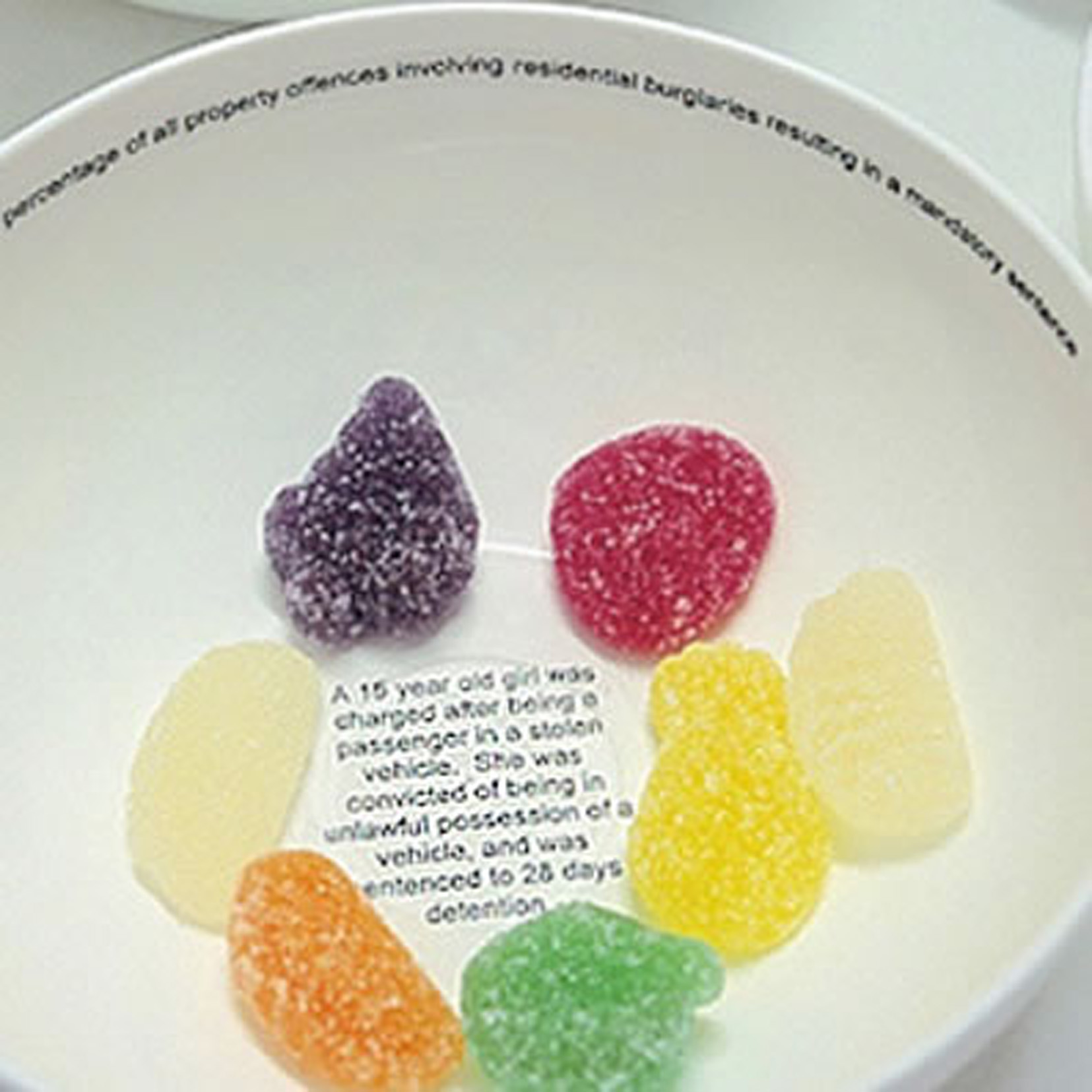 The Art of Good Reasoning adapted statistical information, quotations and case studies from the 100 submissions to the Senate Legal and Constitutional References Committee for the Committees inquiry into the Human Rights (Mandatory Sentencing of Juvenile Offenders) Bill 1999. In a stark convenience store-style environment, the sweet aroma of lollies enticed the viewer into the space. Each of the fifty-two bowls illustrated a statistic; with the volume of lollies representing that statistic in percentage terms. At the bottom of each bowl a case study or quote was present. In order to see this, the viewer often had to push the lollies in that bowl aside. The temptation to eat (steal) a lolly was further galvanized by this physical interaction with the lollies.